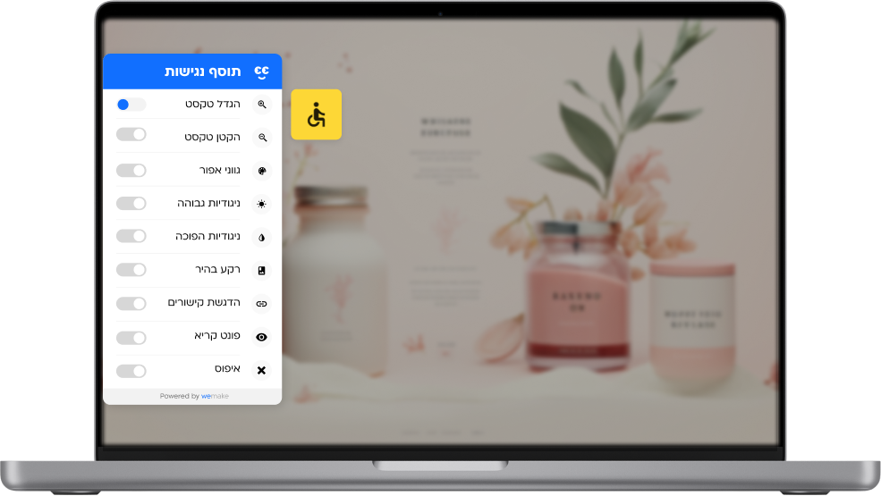תוסף הנגישות מותאם לאתרי וורדפרס, קל ופשוט להתקנה ומשפר את את חווית המשתמש באתר. התוסף עוזר להתאים את אתרכם לבעלי מוגבלויות ומאפשר להם לגלוש בצורה מותאמת יותר באתר.
